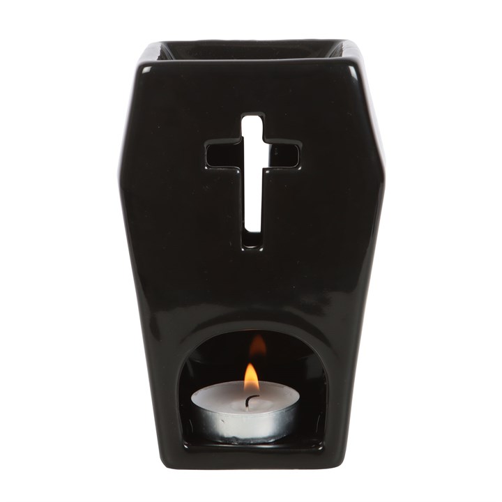 This unique coffin oil burner is perfect for those who appreciate gothic style and unconventional decor. When a lit tealight is placed inside, the cut out cross design is illuminated, casting ambient light and shadows around the room. A great statement piece for the home.
