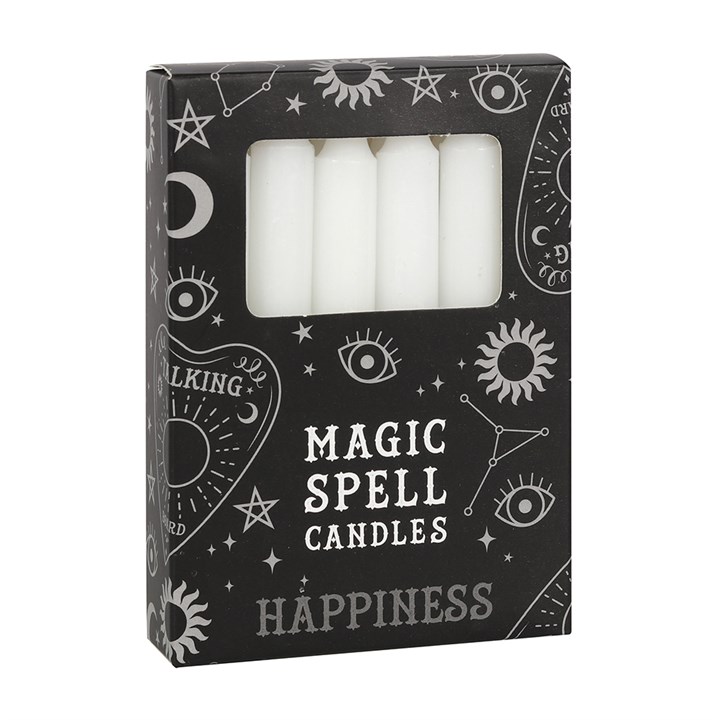 Pack of 12 white spell candles for use with rituals to attract happiness, new beginnings and spiritual growth. Candle magic is one of the simplest forms of spell casting in which the caster decides on a goal, visualizes the end result and focuses intent or will to manifest that result. Approximate burn time of 90 minutes. 70% unscented paraffin and 30% stearic acid. Vegan.