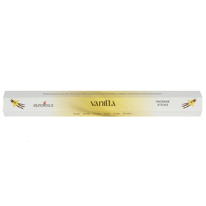 A box of 6 packs of Vanilla fragranced incense sticks by Elements. Each pack contains 20 incense sticks. Product Dimensions: H2.5cm x W24cm x D3cm Packaged Dimensions: H5.5cm x W25cm x D9cm