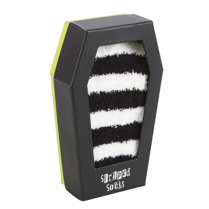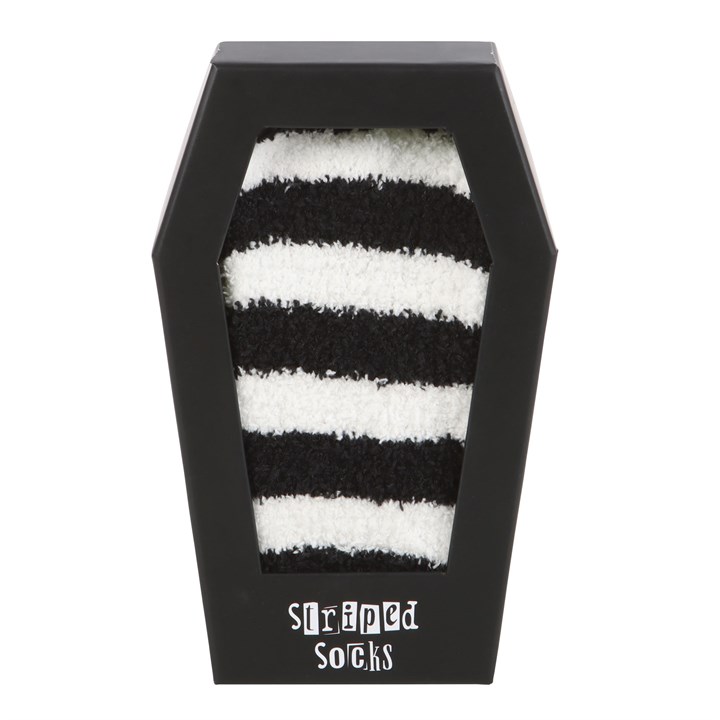 Reawaken your soul and treat your feet by enveloping them in these fluffy black and white striped socks. Presented in a coffin-shaped gift box they make a perfect gift or stocking stuffer for anyone who embraces an emo aesthetic.
